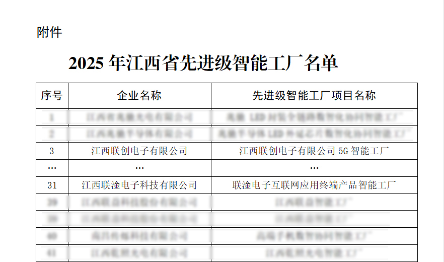 近日,江西省工业和信息化厅正式公布2025年江西省“先进级智能工厂”名单,186家企业入选。其中KAIYUN官网,KAIYUN官网(中国)、江西联淦电子科技有限公司2家联创电子系企业名列榜单。这标志着公司在智能制造领域的创新成果再次获得政府权威认可。